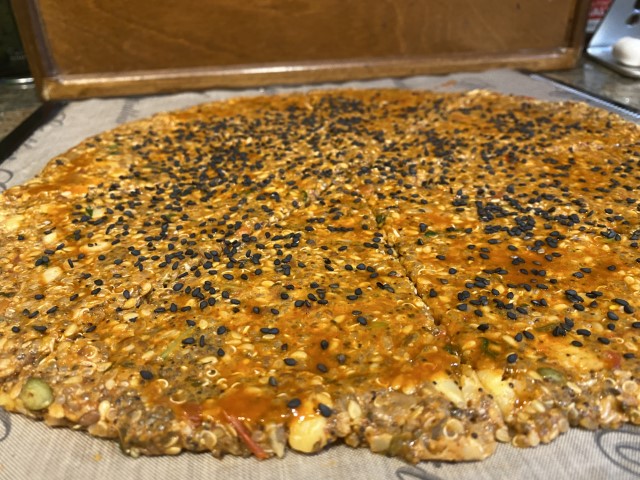 Cook: 3/4 cup uncooked Chick Pea Rice per the direction on bag.. - Mix flax with water and let sit for 1.5 to 2 hours. This helps the flax “set up”, creating a gel that will serve to bind your ingredients. After the flaxseed has “gelled” add it, along with the remaining ingredients to a very large bowl. Spread on Dehydrator sheets. Bake til done at 350 degrees 35 minutes. Check often.